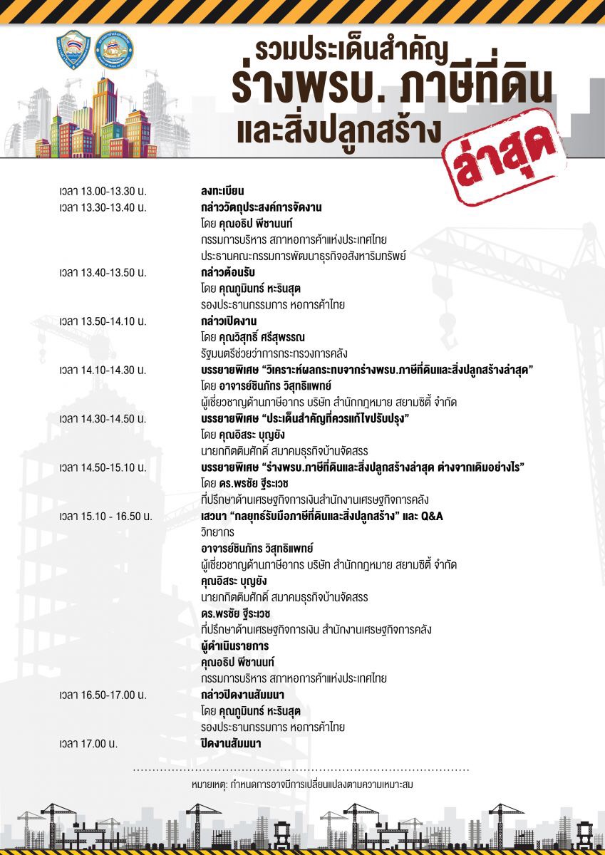 เชิญเข้าร่วมรับฟังการเสวนา รวมประเด็นสำคัญ ร่าง พรบ.ภาษีที่ดินและส่ิงปลูกสร้าง ผ่านทาง Facebook live ณ ห้องประชุมหอการค้าจังหวัดศรีสะเกษ ในวันจันทร์ที่ 12 กุมภาพันธ์ 2561 ตั้งแต่เวลา 13.00 – 17.00 น. สนใจติดต่อสอบถามเพิ่มเติมได้ที่ 083-966-9553