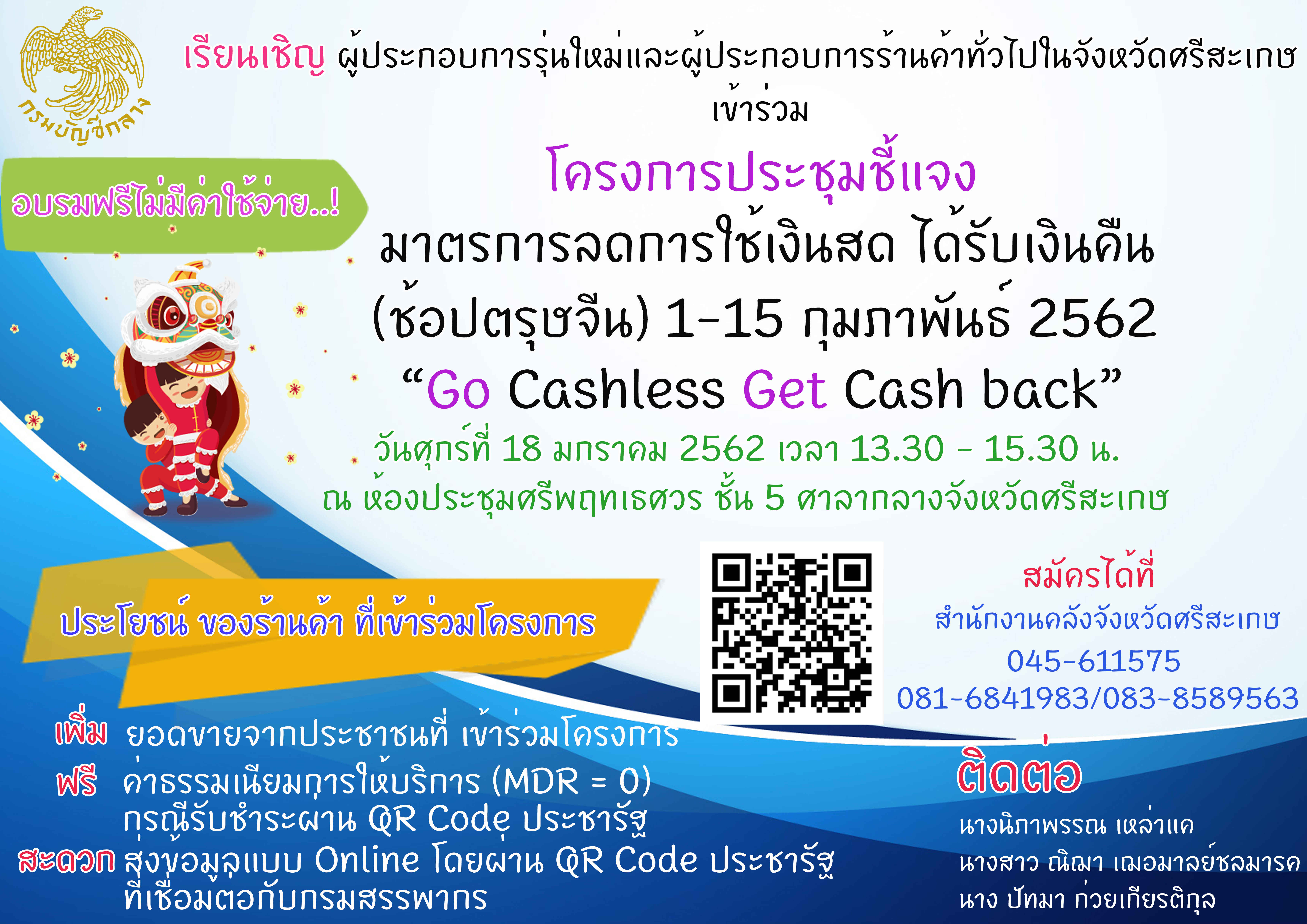ขอเชิญผู้ประกอบการจังหวัดศรีสะเกษ เข้าร่วมโครงการประชุมชี้แจงมาตรการ ลดการใช้เงินสดได้รับเงินคืน ณ ห้องประชุมศาลากลางชั้น 5 ในวันศุกร์ที่ 18 มกราคม2562 เวลา 13.30 นเป็นต้นไป (ช๊อปตรุษจีนวันที่ 1-15 กุมภาพันธ์ 2562 )