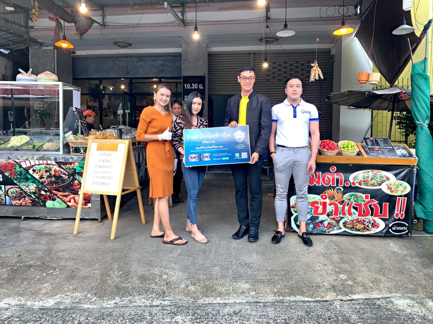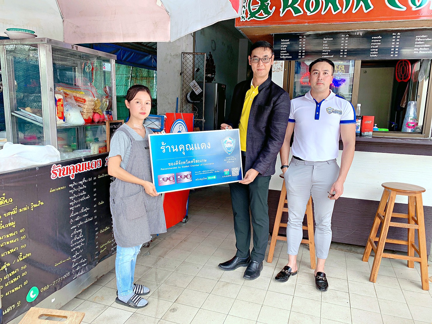 นายสฤษฏ์ นาควารินทร์ ประธานหอการค้าจังหวัดศรีสะเกษ พร้อมด้วย นายคณินท์ศักดิ์ สมทรัพย์ รองเลขาธิการ YEC SISAKET มอบป้ายของดีศรีสะเกษ รับรองโดยหอการค้าจังหวัดศรีสะเกษ
