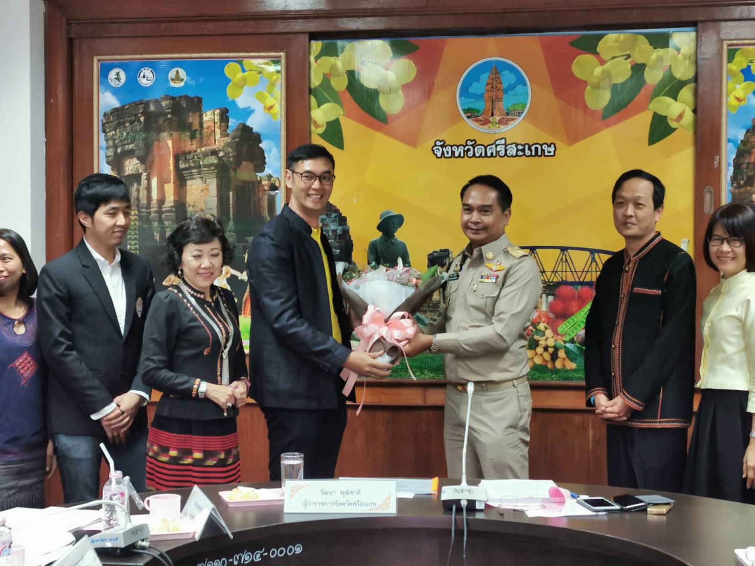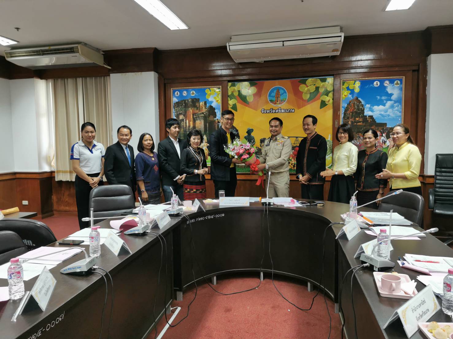 นายสฤษฏ์ นาควารินทร์ ประธานหอการค้าจังหวัดศรีสะเกษ นายภูวนัตถ์ มหาสุวีระชัย ประธานประธาน yec ศรีสะเกษ พร้อมคณะกรรมการหอการค้าจังหวัดศรีสะเกษ กรรมการ yec ศรีสะเกษ ร่วมประชุมคณะกรรมการ รวมภาครัฐและเอกชนเพื่อพัฒนาและแก้ไขปัญหาทางเศรษฐกิจจังหวัดศรีสะเกษ (กรอ.ศรีสะเกษ) ครั้งที่ 1/2562 พร้อมมอบช่อดอกไม้แสดงความยินดีกับ นายวัฒนา พุฒิชาติ ผู้ว่าราชการจังหวัดศรีสะเกษ ที่ได้รับรางวัลผู้ว่าสำเภาทอง ประจำปี 2562 และ รับมอบช่อดอกไม้จากท่านผู้ว่าราชการจังหวัดศรีสะเกษ เนื่องในโอกาสหอการค้าจังหวัดศรีสะเกษไ ด้รับรางวัลหอการค้ายอดเยี่ยมประจำปี 2562 ในวันที่ 19 พฤศจิกายน 2562 เวลา 13.30 น. ณ ห้องประชุมสระกำแพงใหญ่ ศาลากลางจังหวัดศรีสะเกษชั้น 4